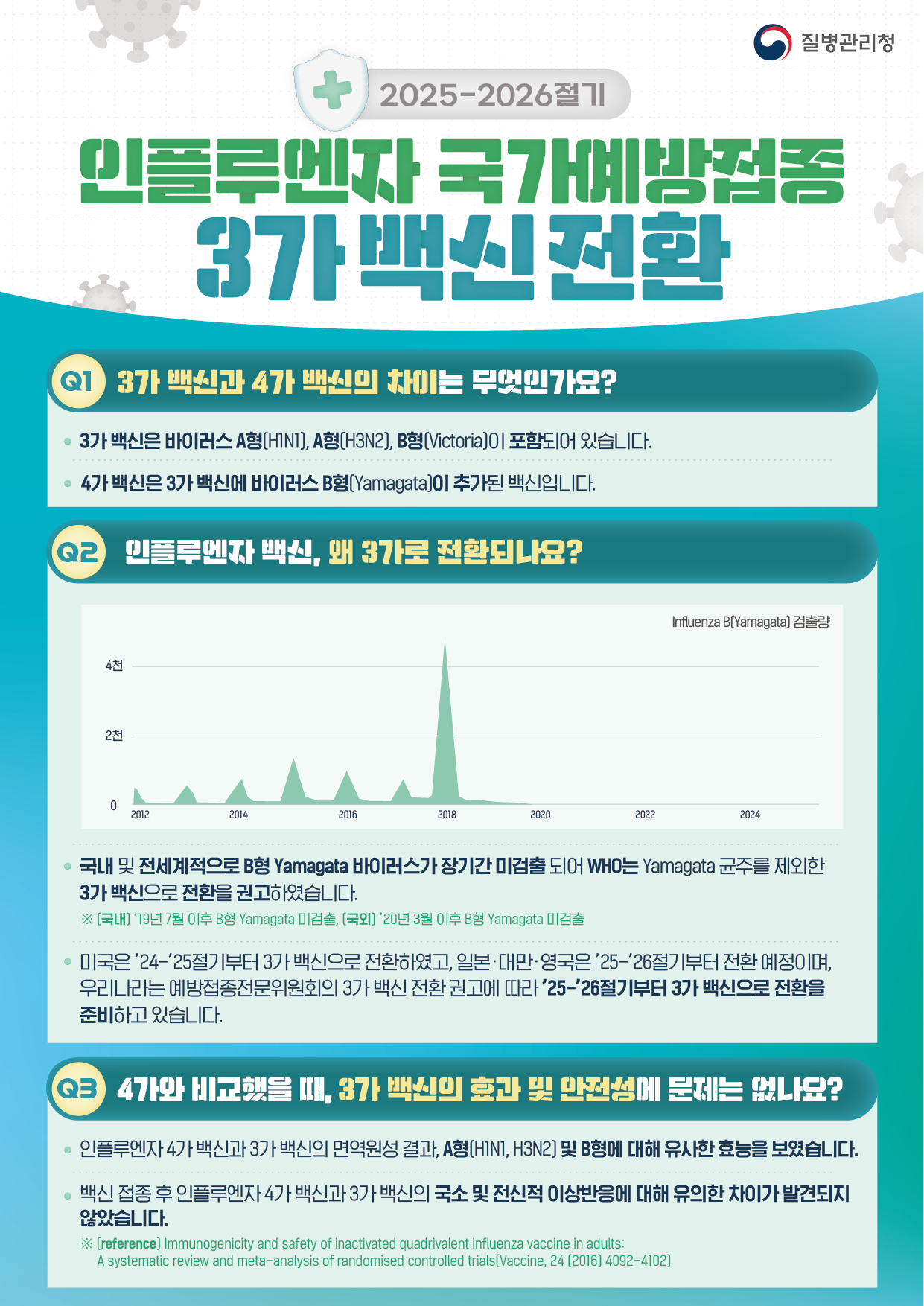 최근 전 세계적으로 B형 Yamagata 바이러스가 장기간 검출되지 않음에 따라, 우리나라 2025~2026절기 인플루엔자 국가예방접종은 4가 백신에서 3가 백신으로 전환됩니다.