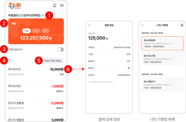 ②선택한 가맹점의 일/주/월 매출 확인 가능