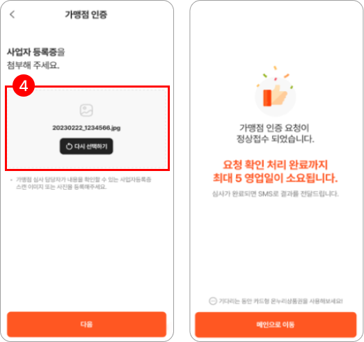 ⑤ 가맹점 이용약관 동의 후, 다음 버튼을 누르면 가맹점 인증 요청 완료