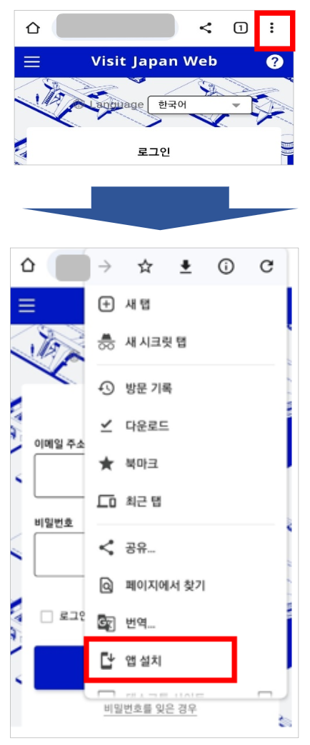 ※ 팝업이 표시되지 않는 경우는 브라우저 우측 상단의 메뉴 ‘︙’를 탭하여 ‘앱 설치’
