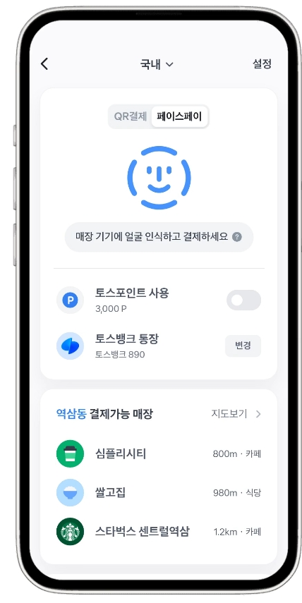 - 주변 사용 가능 매장을 알고 싶은 경우 토스 앱에서 ‘페이스페이’를 검색해 확인